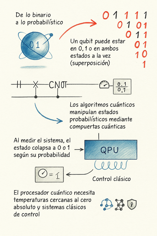 En su lugar, manipulamos estados probabilísticos, y las “operaciones” (llamadas compuertas cuánticas) transforman esos estados según las reglas de la física cuántica.