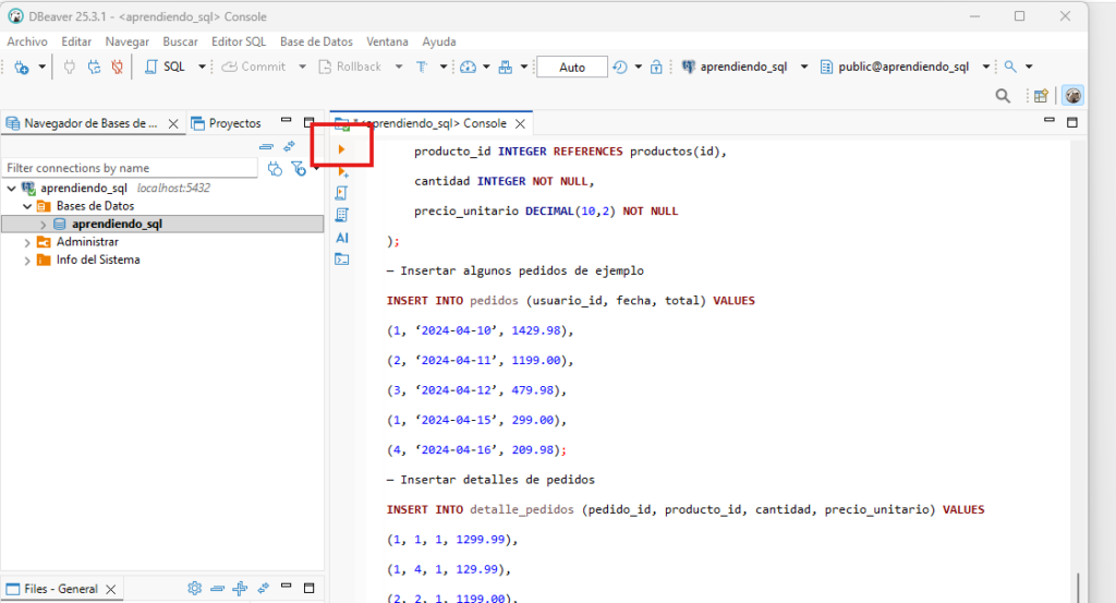 - Haz clic en el botón Ejecutar Script SQL (o presiona Ctrl+Alt+Shift+X)